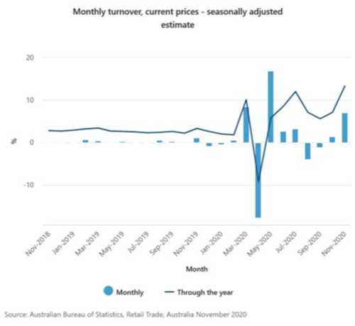Australian retail sales bounced 7.1% in November, bringing retail sales up 13.3% through the year.