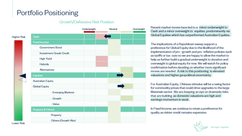 | Technical - Neutral | Technical - Neutral Seasonality has played out much as we expected in the later months of the year with several wobbles since August rolling through to a stronger November and December in equity markets. Solid economic data, several rate cuts from the Federal Reserve, and the removal of uncertainty with a quickly decided and uncontested US election result provided a smooth path for a rally. Momentum in equity and bond markets looks strong, while volatility in these markets have declined. Credit spreads continue to signal confidence in the health of corporates. Positioning is bullish across retail and institutional investors, but sentiment surveys indicate a more neutral mindset. Despite stretched valuations, there is no clear display of exuberance in conventional markets, though this could change quickly as the nascent rally in speculative assets indicate some level of froth in broader markets. |
