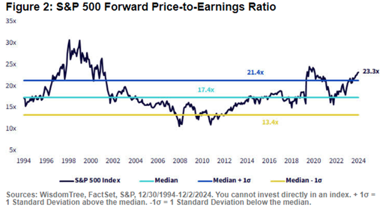 International equities have had a positive year with some extremes of performance in Asia with the Japanese Nikkei 225 falling dramatically when the Bank of Japan hiked while the Chinese Shanghai/Shenzen index rallied very strongly in September and October as stimulus measures were announced. Overall, the US has led major global markets with the Nasdaq composite ahead of the S&P on yearly performance. The ‘Magnificent Seven’ have performed strongly for the year, in particular NVIDIA riding the AI boom. Valuations are at highs for the S&P however this isn’t the same extreme in other global equity markets. We see potential for a further run up in global equities despite high valuations, while creating vulnerability to a meaningful correction in 2025 before resuming an upward trend as earnings growth remains robust. Much uncertainty surrounds this scenario with political and geopolitical forces easily combining to upset this scenario of net positives. The following chart gives some perspective on the US relative valuation on the forward price to earnings measure, at highs last seen in the late 1990s besides the 2020 pandemic highs.