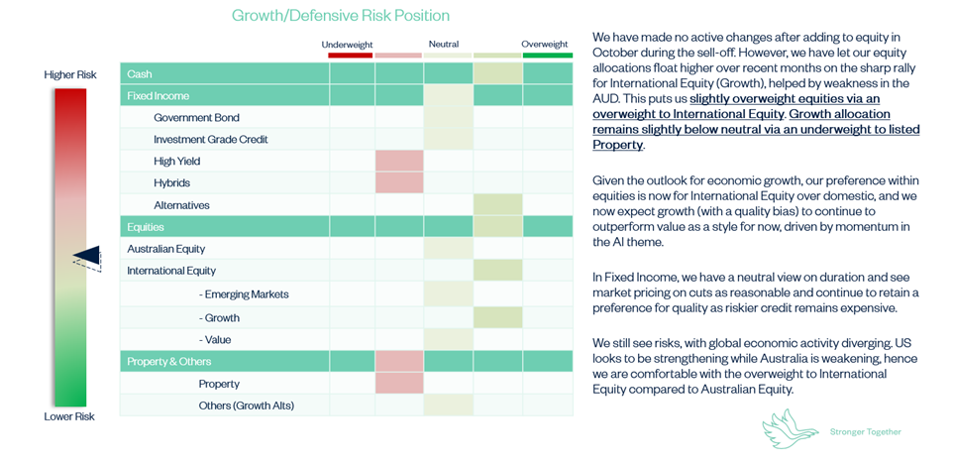 International equities, particularly the US larger cap stocks have performed well for the second quarter in a row following the sharp correction in October. The ‘Magnificent Seven’ continued to perform strongly, with Nvidia leveraging the AI thematic. There is value in US small and mid caps and in non-US equity markets. We are conscious that the valuations in large caps appear high, however as a business cycle recovery gets underway across most countries, there is room to grow into these valuations.