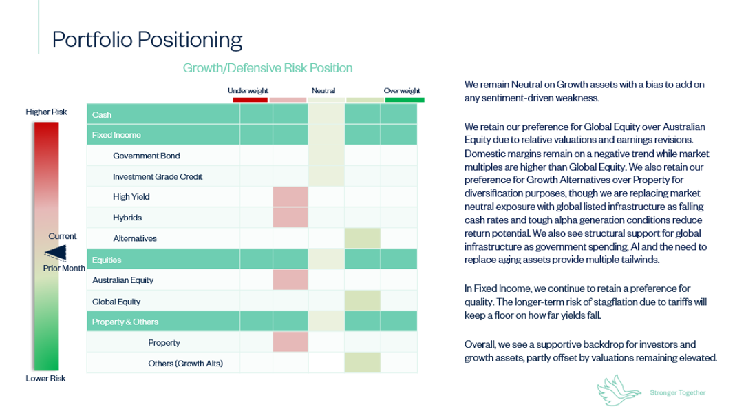 Australia: Domestic growth is gradually improving, supported by better business conditions and improving consumer sentiment, although a mild pickup in inflation is emerging as activity firms. The Reserve Bank of Australia has shifted to a more neutral stance after an extended hiking cycle, and the combination of stabilising rates and softer earnings momentum relative to global peers argues for maintaining a tactical tilt toward offshore equity markets over local shares.