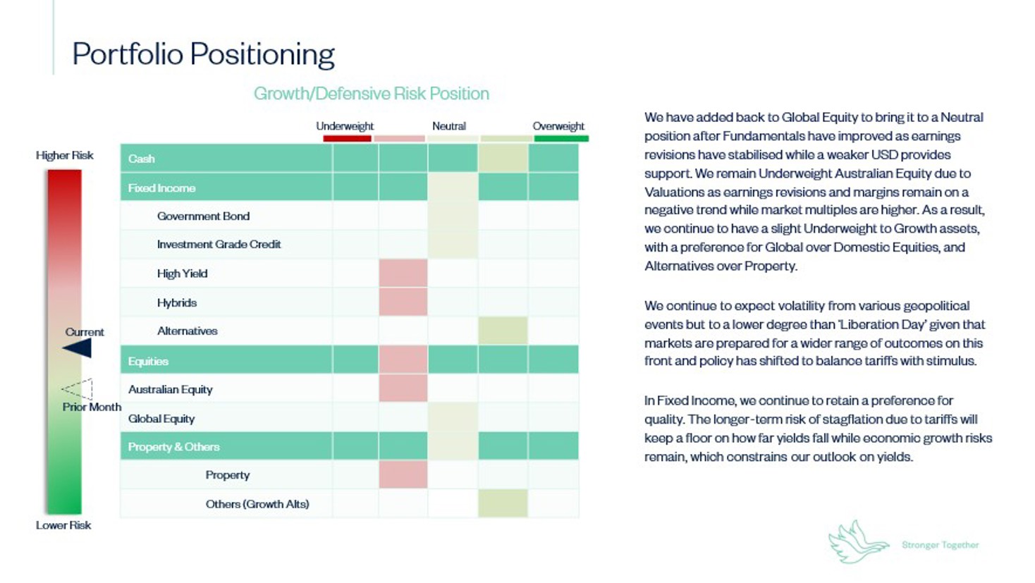 The markets have rebounded from the depths of tariff and geopolitical shocks, and while momentum has continued, we appear to be in a phase of ‘climbing a wall of worry’. This is expected to be a continued grinding up trend with occasional shocks and pullbacks. Reluctant institutional and bearish holdouts will likely allocate back to equity and growth assets as there are opportunities on pullbacks and as additional hard economic data and company reporting come through. Sentiment has been relatively subdued across the world, with some emerging signs of recovery in US business sentiment and some emerging positive signs from Australian businesses.  Within our model portfolios, we added back growth asset classes to a smaller overall underweight in June, allocating to Global equities where we see more positive signals than Australia. This is based on our nuanced Fundamental view, with some slight negatives on valuation and a neutral view on Technicals. We are open to adjusting this position on further volatility and as evidence changes from our slightly conservative positioning on a tactical timeframe.