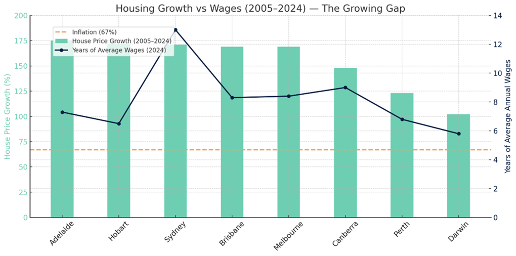 - The orange line shows inflation (67%) over the same period, highlighting how much house prices have exceeded it.